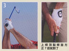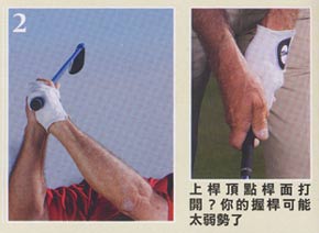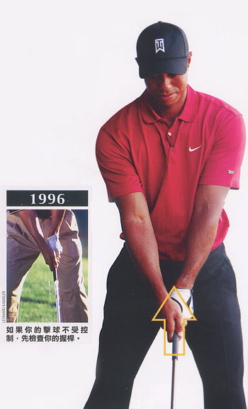 握桿是指你的姆指與食指所形成的 V 字型指向左肩中央)你可以從右這張 1996 年的照片中看出,老虎當時的握桿較為強勢,如果從他的雙眼往下看,雙手都朝右側轉動許多。因為握桿強勢,老虎在上桿頂點時會有關閉桿面的傾向,而必須要在下桿時做出補償動作。