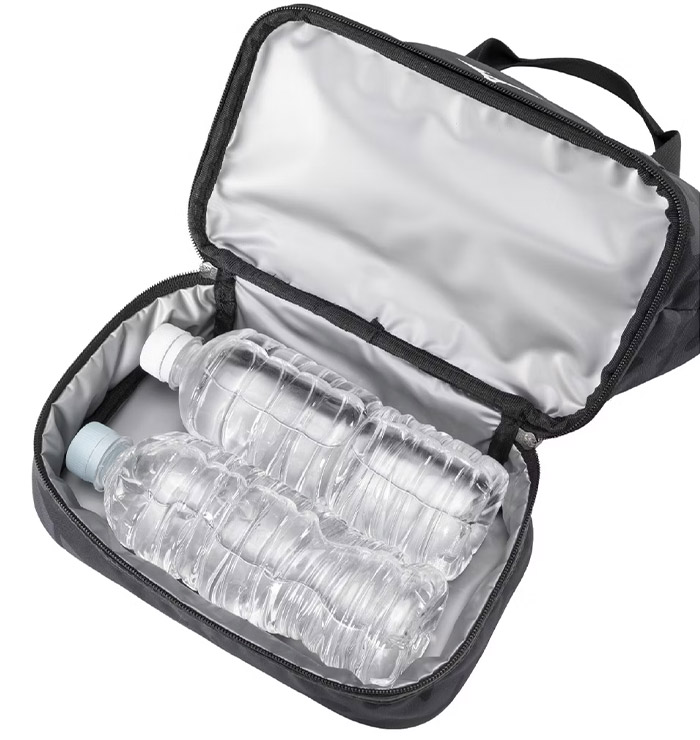 ● 特性:A.雙層:下方保冷裝置,可入2瓶600ml B.前片子袋:可隨手放小物 C.表布:防水