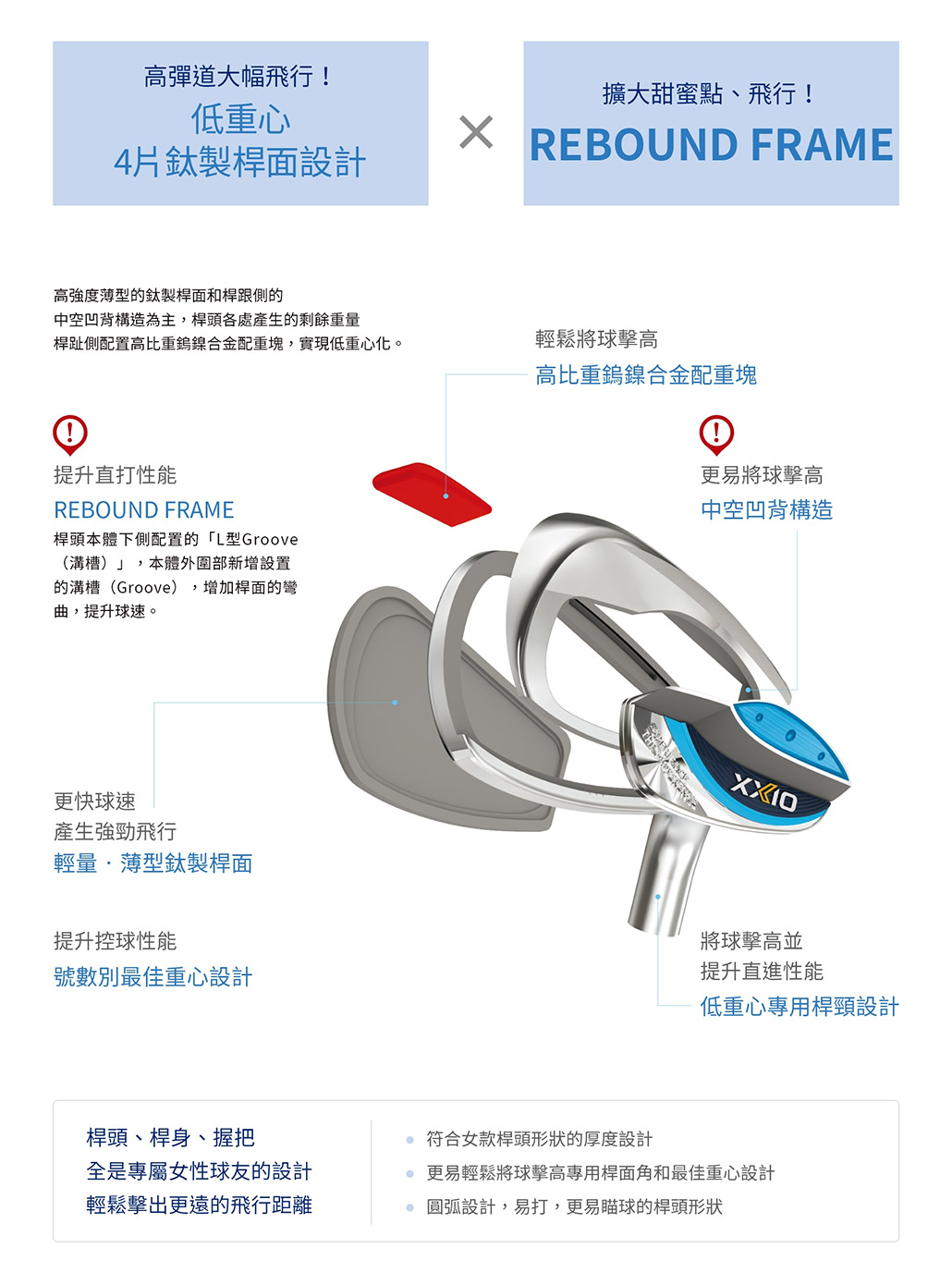 | 桿頭材質 | 桿面:鈦(Super-TIXⓇ 51AF) (#5∼9) 本體:SUS630+高比重鎢鎳合金重量塊 (#8∼SW) 本體:SUS630 |