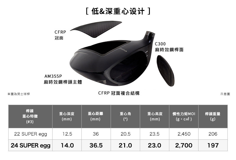 桿面: 麻時效鋼(C300) 桿頭主體: 麻時效鋼(AM355P) 冠面: 碳(CFRP) |